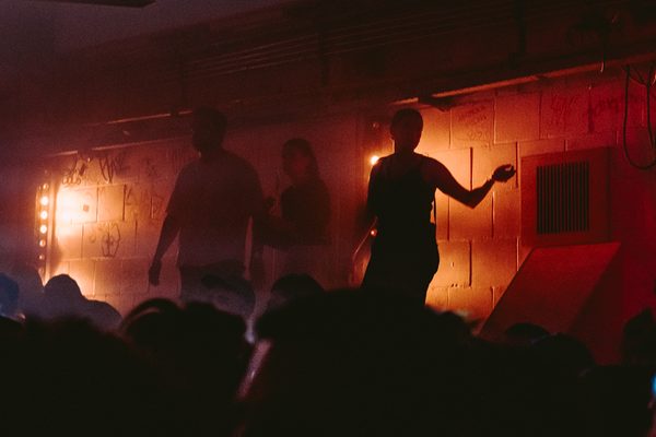 A dark corridor covered in graffiti, surrounded by enthused dancers