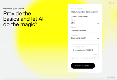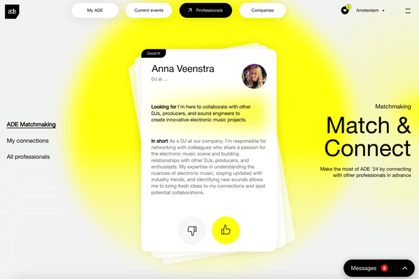 The newest feature added to the ADE Pro database is the ADE Matchmaking. This tool provides smart recommendations for fruitful connections and sets up a valuable network before you even attend the ADE Pro Conference. It's your online contacts archive and an easy-to-access way of linking with professionals with similar interests. By using 'ADE Matchmaking', you’ll be able to plan meet-ups during ADE effortlessly, message other professionals, and find the people that suit your electronic music industry needs.