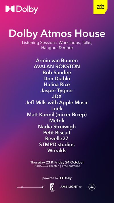 The Dolby Atmos House will be open to the public at TOBACCO Theater as part of ADE, daily from 11:00 a.m. to 8:00 p.m. CET on Thursday, October 23, and Friday, October 24.