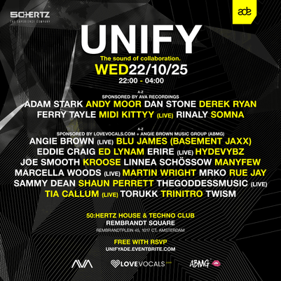 Unify is a special showcase during Amsterdam Dance Event where three powerhouse brands AVA Recordings, Lovevocals.com, and Angie Brown Music Group come together to celebrate music, artistry, and collaboration. This unique event highlights a diverse lineup of top-tier talent, uniting some of the most exciting artists and voices across the global dance music spectrum. With unforgettable performances and a shared vision of connection through sound, Unify promises an inspiring night that captures the true spirit of ADE.