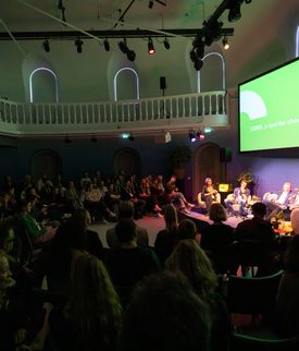 Omar Barghouti (BDS movement), Floor Beuming (Amnesty International), Jurry Oortwijn (Paradiso).