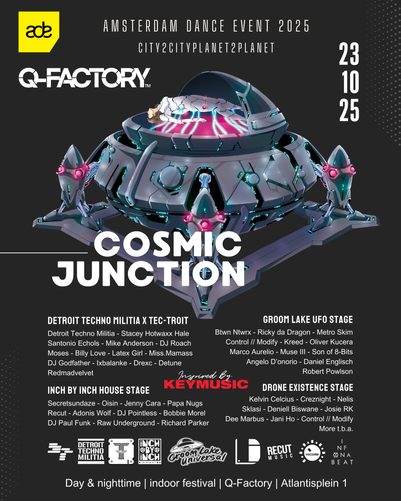 On October 23rd at Q-Factory, Cosmic Junction brings together 40+ international artists across 4 stages for a full day-to-night journey: This special collaboration unites Groom Lake Universal Amsterdam with Detroit Techno Militia, Tec-Troit Electronic Festival, Glimpse Magazine, Inch by Inch Records, Drone Existence, UFM Recordings, Infonabeat Records, Vocoder, Suckerpunch, and Recut Music — all under one roof for an immersive ADE experience.Panels & Talks on the future of distribution and the culture of electronic musicPanels about the history, present and future of House and Techno music discussed by Chicago, Detroit vs the rest of the world.
