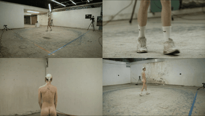 In this durational performance, circling becomes both choreography and commentary—mapping invisible histories and tracing the ghostlines of subcultural space. Ros walks along hand-drawn lines inspired by gymnasium courts once transformed into ecstatic all-night party spaces. Luminous paint marks Nike Air Max 90 footprints, a lasting record of movement and endurance.