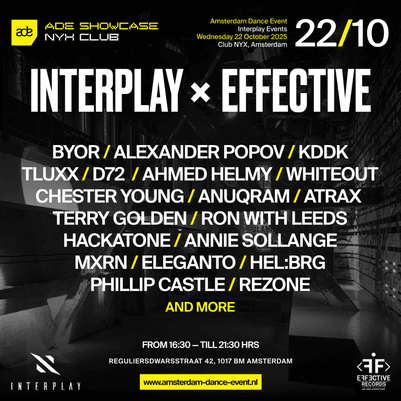 Interplay and Effective Records join forces once again for their 2025 ADE showcase, bringing together world renowned artists, label residents and friends. Expect an unforgettable night featuring Alexander Popov, BYOR, Ahmed Helmy, KDDK, MXRN and many more, delivering the full spectrum of modern electronic sound straight from the heart of Amsterdam.