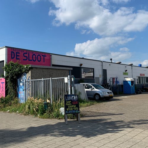 In May 2022, theater collectives De Warme Winkel and BOG. opened the first Amsterdam theater hub behind Amsterdam Sloterdijk station: De Sloot. A workshop for theater creators, featuring a fully equipped flat-floor theater hall, a smaller venue, several large rehearsal spaces and workshops, and a spacious café/restaurant. Since then, we’ve evolved into a creative workspace bustling with young theater creators and established artists.